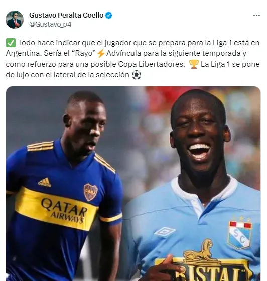 “Todo hace indicar que el jugador que se prepara para la Liga 1 está en Argentina. Sería el Rayo Advíncula para la siguiente temporada y como refuerzo para una posible Copa Libertadores. La Liga 1 se pone de lujo con el lateral de la selección”, escribió el comunicador.