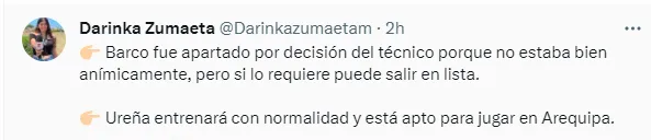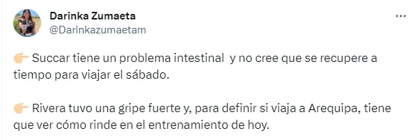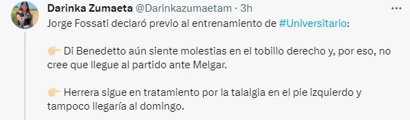 “Di Benedetto aún siente molestias en el tobillo derecho y, por eso, no cree que llegue al partido ante Melgar. Herrera sigue en tratamiento por la talalgia en el pie izquierdo y tampoco llegaría al domingo. Succar tiene un problema intestinal y no cree que se recupere a tiempo para viajar el sábado. Rivera tuvo una gripe fuerte y, para definir si viaja a Arequipa, tiene que ver cómo rinde en el entrenamiento de hoy. Barco fue apartado por decisión del técnico porque no estaba bien anímicamente, pero si lo requiere puede salir en lista. Ureña entrenará con normalidad y está apto para jugar en Arequipa”, informó la comunicadora en su cuenta oficial de twitter.