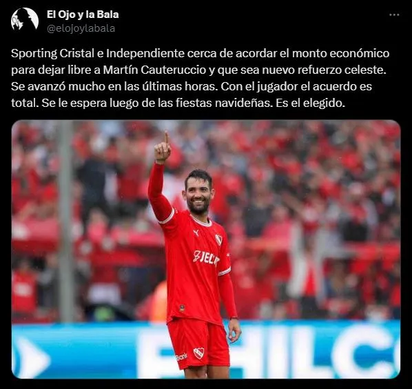 Según lo que informa este confiable usuario, todo está encaminado para poder unir ambos caminos: “Sporting Cristal e Independiente cerca de acordar el monto económico para dejar libre a Martín Cauteruccio y que sea nuevo refuerzo celeste. Se avanzó mucho en las últimas horas. Con el jugador el acuerdo es total. Se le espera luego de las fiestas navideñas. Es el elegido”.