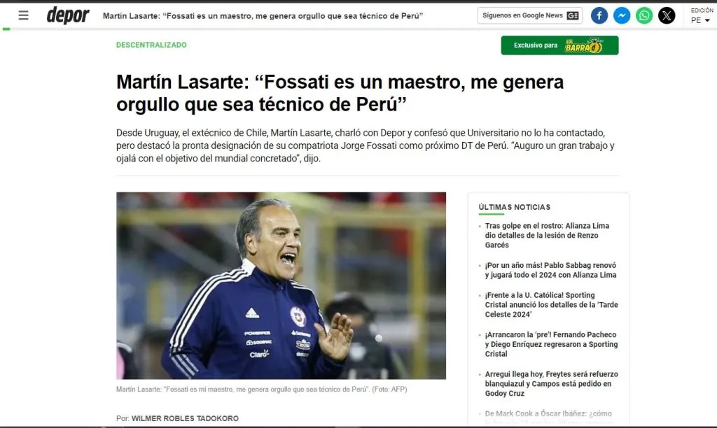 Ahora mismo, se desconocen las luces posteriores a la salida de Jorge Fossati. Podría ser el nombre de Martín Lasarte para ser el nuevo entrenador de Universitario de Deportes. Pero mientras no existan mayores certezas, está algo lejos esa idea. Que sería en el papel previo, muy provechoso en todo sentido, debido a que al día de hoy, un ex seleccionador nacional, podría sumar demasiado en el ambiente competitivo de la “U”.