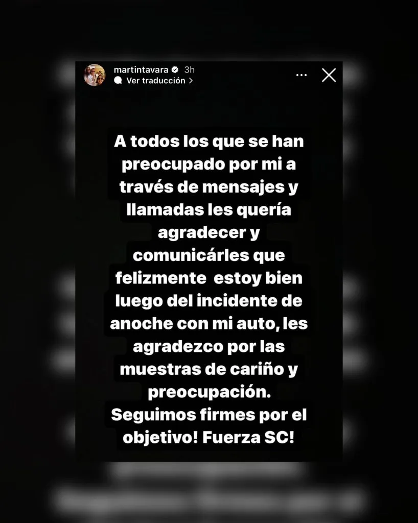 “A todos los que se han preocupado por mí a través de mensajes y llamadas les quería agradecer y comunicarles que felizmente estoy bien luego del incidente de anoche con mi auto. Les agradezco por las muestras de cariño y preocupación. Seguimos firmes por el objetivo. ¡Fuerza SC!”. Con esto se podría decir que ya terminó el problema, pero queda esperar un poco más.