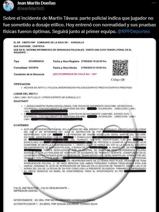 “Sobre el incidente de Martin Távara: parte policial indica que el jugador no fue sometido a dosaje etílico. Hoy entrenó con normalidad y sus pruebas físicas fueron óptimas. Seguirá junto al primer equipo”. Explicó Jean Martin Dueñas en su cuenta de Twitter en calidad de primicia.
