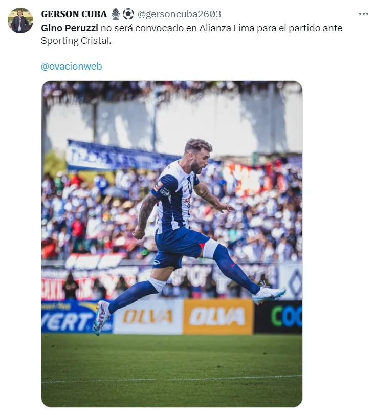 “Gino Peruzzi no será convocado en Alianza Lima para el partido ante Sporting Cristal“, señaló el periodista.