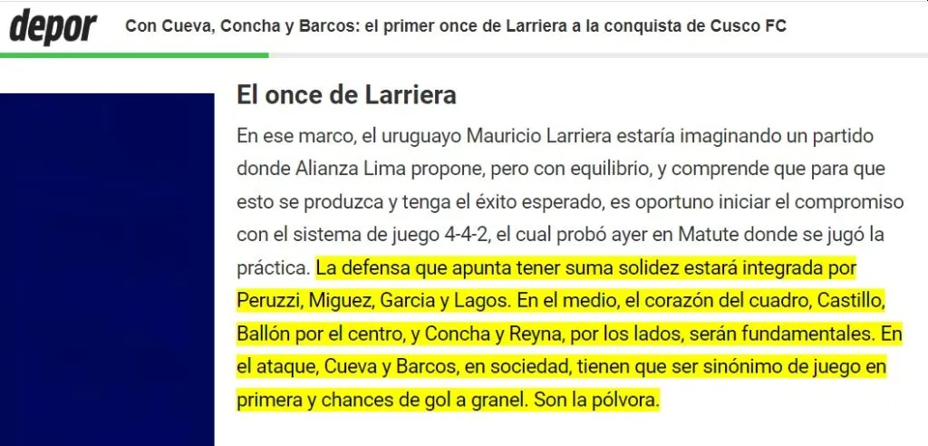 Catalogándose como arriesgado pues juega ante Cusco FC en el estadio Inca Garcilaso de la Vega, el técnico uruguayo Mauricio Larriera definió el once que empleará Alianza Lima.