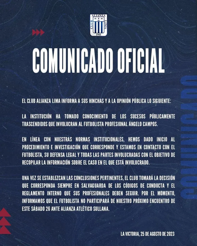 Alianza Lima regresa a la actividad cuando enfrente a Academia Cantolao en Lima por la fecha 12 del Torneo Clausura de la Liga 1 Perú 2023 y tendrá como entrenador a Mauricio Larriera. Para ese partido saldría con el siguiente once: Marco Saravia; Gino Peruzzi, Pablo Míguez, Santiago García, Ricardo Lagos; Josepmir Ballón, Jesús Castillo, Jairo Concha; Bryan Reyna, Christian Cueva, Hernán Barcos.