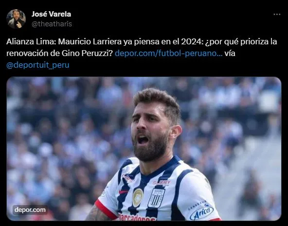 “Mauricio Larriera lo quiere en su equipo para la temporada 2024 que aseguró la Copa Libertadores de América y sobre ello ya trabaja el departamento de deportes. Al jugador que se le quiere más tiempo en Matute es Gino Peruzzi. 3,285 minutos de juego en la Liga 1 Betsson desde su llegada a mediados del año 2022 hasta hoy; 38 partidos, de los cuales fue titular en 25, y dos gritos de gol a todo pulmón”. Reveló el periodista José Varela.
