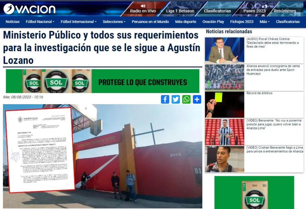 Radio Ovación accedió al archivo legal exacto, para luego explicar este caso: “El Ministerio Público citó a una serie de autoridades de la Federación Peruana de Fútbol (FPF) y apoderados de los clubes del medio local para que amplíen declaraciones sobre la investigación que se sigue contra el presidente de la FPF, Agustín Lozano y otros, por la presunta comisión del delito de Organización Criminal y otros, en perjuicio del Estado. También se programó una serie de diligencias de deslacrados, visualizaciones y transcripciones de video sobre posibles irregularidades en la FPF”.