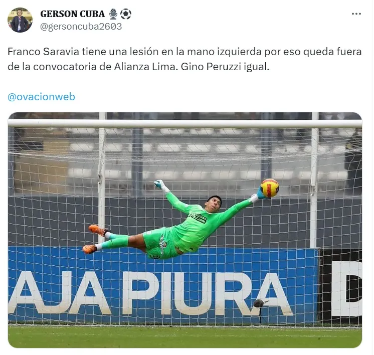 “Franco Saravia tiene una lesión en la mano izquierda por eso queda fuera de la convocatoria de Alianza Lima. Gino Peruzzi igual”, comentó.