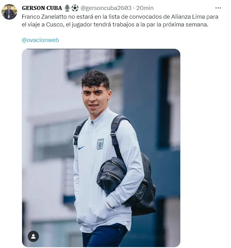 Gerson Cuba así lo informó en su cuenta de Twitter: “Franco Zanelatto no estará en la lista de convocados de Alianza Lima para el viaje a Cusco, el jugador tendrá trabajos a la par la próxima semana”, argumentó.
