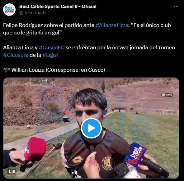Felipe Rodríguez, se confesó ante los medios de comunicación: “Alianza Lima es un club al cual le tengo cariño, es recíproco con los hinchas también y bueno, hay muchísimo respeto de por medio. Imagínate que mi hijo nació cuando jugaba en Alianza, fue la primera vez que pisó un estadio, mi familia también con el club, pero hoy por hoy me debo a Cusco FC y obviamente que quiero ganarle”.