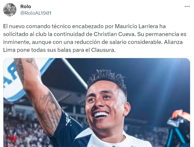 “El nuevo comando técnico encabezado por Mauricio Larriera ha solicitado al club la continuidad de Christian Cueva. Su permanencia es inminente, aunque con una reducción de salario considerable. Alianza Lima pone todas sus balas para el Clausura”, escribió Rolo en su cuenta oficial de Twitter.