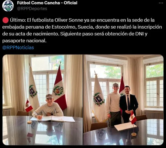 Yendo con la información pura y dura, RPP Noticias informó de manera exclusiva lo siguiente: “Último: El futbolista Oliver Sonne ya se encuentra en la sede de la embajada peruana de Estocolmo, Suecia, donde se realizó la inscripción de su acta de nacimiento. Siguiente paso será obtención de DNI y pasaporte nacional”.
