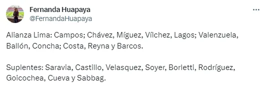 Por su parte, Alianza Lima mostrará una alienación sorpresiva para lograr un milagro ante Cusco FC. Mauricio Larriera va de la siguiente manera, con: Ángelo Campos; Edison Chávez, Pablo Míguez, Yordi Vílchez, Ricardo Lagos; Oswaldo Valenzuela, Josepmir Ballón, Jairo Concha; Gabriel Costa, Bryan Reyna y Hernán Barcos.