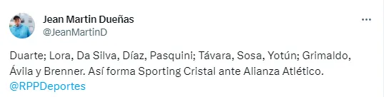 Mientras tanto Sporting Cristal tendrá este once ante Alianza Atlético y también esperarán con mucha fe un milagro. El cuadro celeste va de la siguiente manera: Duarte; Lora, Da Silva, Díaz, Pasquini; Távara, Sosa, Yotún; Grimaldo, Ávila y Brenner.