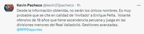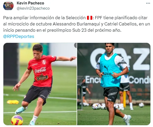 “Para ampliar información de la Selección: FPF tiene planificado citar al microciclo de octubre Alessandro Burlamaqui y Catriel Cabellos, en un inicio pensando en el preolímpico Sub 23 del próximo año. Desde la información obtenida, no serán los únicos nombres. Es muy probable que se cite en calidad de invitado a Enrique Peña. Volante ofensivo de 18 años que tiene ascendencia peruana y juega en las divisiones menores del Real Valladolid. Gestiones avanzadas”, escribió en su cuenta oficial de X (antes llamado Twitter).