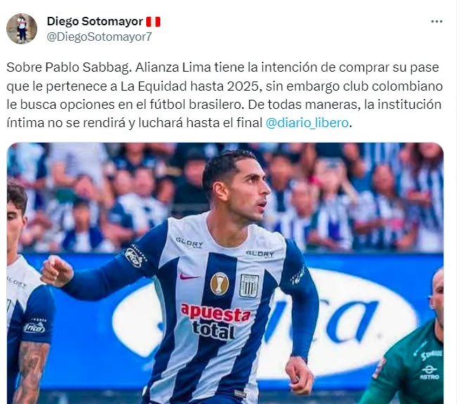 “Sobre Pablo Sabbag. Alianza Lima tiene la intención de comprar su pase que le pertenece a La Equidad hasta 2025, sin embargo, el club colombiano le busca opciones en el fútbol brasilero. De todas maneras, la institución íntima no se rendirá y luchará hasta el final”, escribió el comunicador en su cuenta oficial de Twitter.