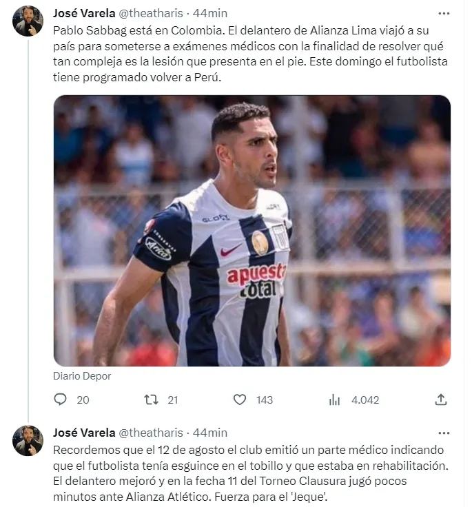 José Varela en Twitter: “Pablo Sabbag está en Colombia. El delantero de Alianza Lima viajó a su país para someterse a exámenes médicos con la finalidad de resolver qué tan compleja es la lesión que presenta en el pie. El domingo el futbolista tiene programado volver a Perú”.