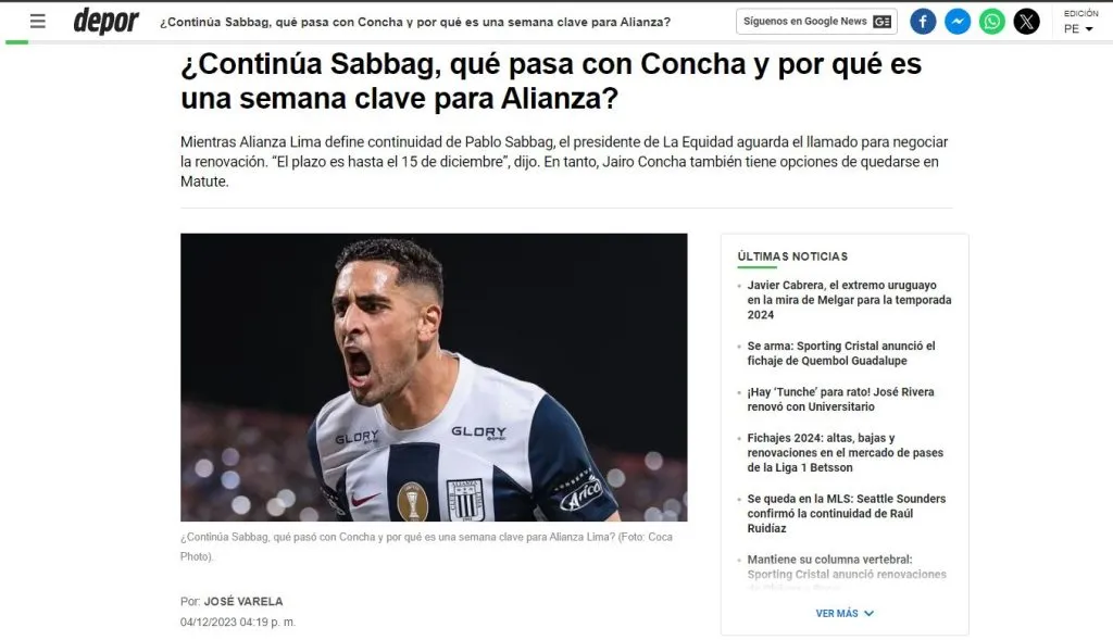 Ese es el caso de Pablo Sabbag quien está pendiente de lo que pase con su futuro ahora mismo: “Sin embargo, eso todavía no pasó y lo podemos señalar con total certeza, porque Depor ha tenido la palabra de Carlos Zuluaga, presidente del importante club colombiano. “Hasta la fecha no tuvimos contacto con Alianza Lima y el plazo vence el 15 de diciembre. Estamos esperando”. Mientras eso no sucede, Sabbag sigue de vacaciones y esperando el llamado desde Matute”.