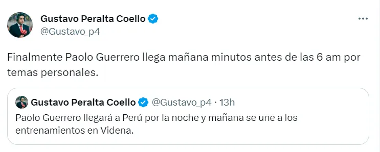 “Finalmente Paolo Guerrero llega mañana minutos antes de las 6 am por temas personales”, anunció el comunicador en su cuenta oficial de Twitter.