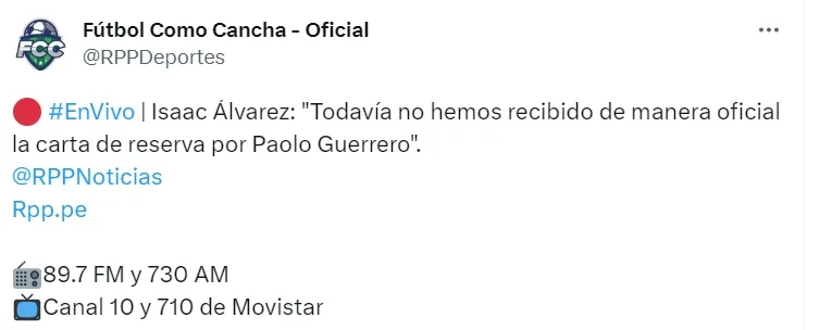 Isaac Álvarez habló con RPP Deportes: “Todavía no hemos recibido de manera oficial la carta de reserva por Paolo Guerrero“, comentó el dirigente de Liga Quito a los micrófonos del programa radial peruano.