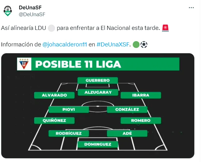 “Así alinearía LDU para enfrentar a El Nacional esta tarde”, escribió el medio deportivo, De Una SF en su cuenta oficial de Twitter.