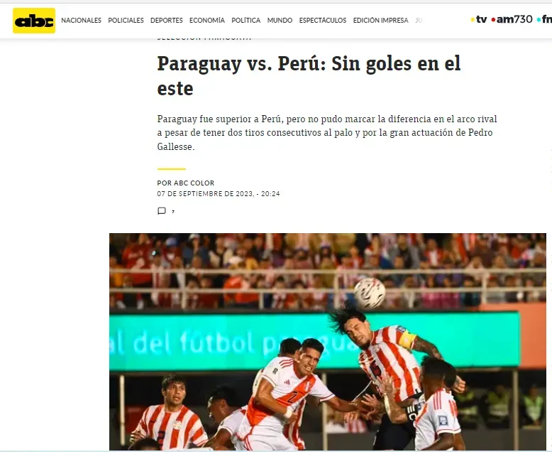 El choque entre los guaraníes y la bicolor atrajo la atención de los medios de comunicación internacionales. El diario ABC tituló su cobertura como: Paraguay vs Perú: Sin goles en el Este. Paraguay fue superior a Perú, pero no pudo marcar la diferencia en el arco rival a pesar de tener dos tiros consecutivos al palo y por la gran actuación de Pedro Gallese, resaltando que a pesar de la superioridad de los locales en el partido, no lograron marcar la diferencia en el arco rival, en parte debido a la destacada actuación del arquero incaico, quien detuvo dos tiros consecutivos al palo.