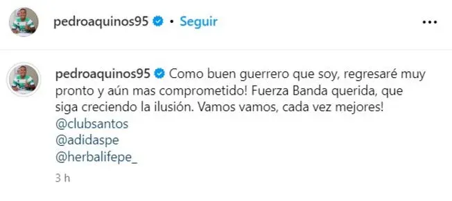 “Como buen guerrero que soy, regresaré muy pronto y aún más comprometido! Fuerza Banda querida, que siga creciendo la ilusión. Vamos vamos, cada vez mejores!”, escribió Pedro Aquino en su cuenta oficial de Instagram.