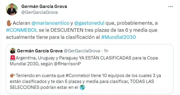 “Aclaran Mariano Antico y Gastón Edul que, probablemente, a CONMEBOL se le DESCUENTEN tres plazas de las 6 y media que actualmente tiene para la clasificación al Mundial 2030”, agregó.