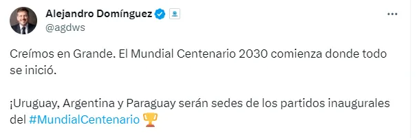 “Creímos en Grande. El Mundial Centenario 2030 comienza donde todo se inició. ¡Uruguay, Argentina y Paraguay serán sedes de los partidos inaugurales del Mundial Centenario”, escribió el presidente de la Conmebol en su cuenta oficial de X (antes llamado Twitter).