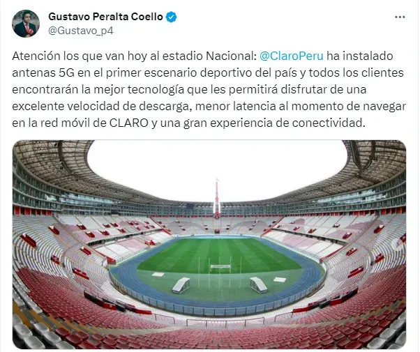 “Atención los que van hoy al estadio Nacional: Claro ha instalado antenas 5G en el primer escenario deportivo del país y todos los clientes encontrarán la mejor tecnología que les permitirá disfrutar de una excelente velocidad de descarga, menor latencia al momento de navegar en la red móvil de CLARO y una gran experiencia de conectividad”, escribió el comunicador.
