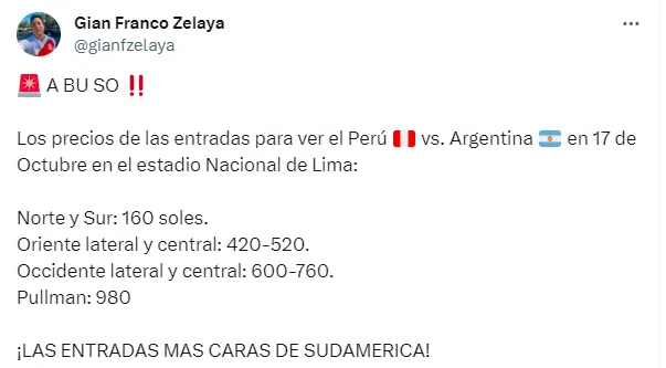 El periodista deportivo Gian Franco Zelaya no pudo evitar comentar sobre estos precios, calificándolos como un abuso. “Los precios de las entradas para ver el Perú vs. Argentina en 17 de octubre en el estadio Nacional de Lima: Norte y Sur: 160 soles, Oriente lateral y central: 420-520, Occidente lateral y central: 600-760, Pullman: 980 ¡LAS ENTRADAS MÁS CARAS DE SUDAMÉRICA!”, expresó el comunicador.
