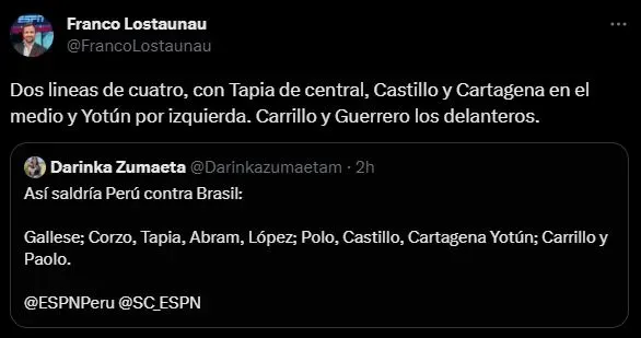 Darinka Zumaeta expone en su cuenta de Twitter lo siguiente: “Así saldría Perú contra Brasil: Gallese; Corzo, Tapia, Abram, López; Polo, Castillo, Cartagena, Yotún; Carrillo y Paolo”. La base de cómo se presentaría el equipo de todos ante el gigante del continente.