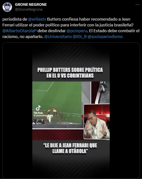 La solución que le entregó Butters a Ferrari se volverá viral seguramente: “Otárola llama al embajador peruano, llaman al Cónsul y, ¿Quién intercede? (…) Y Lula da Silva, que es brasileño, es de Corinthians. Entonces, ahí ya tienes un problema grave porque va a venir acá (Perú) a pedir entradas de cortesía (200 o 300) en un estadio que va a tener 80.000 cremas, los del Timao estarán enardecidos por el caso de racismo”. ¿Cuál será el final de este tema?
