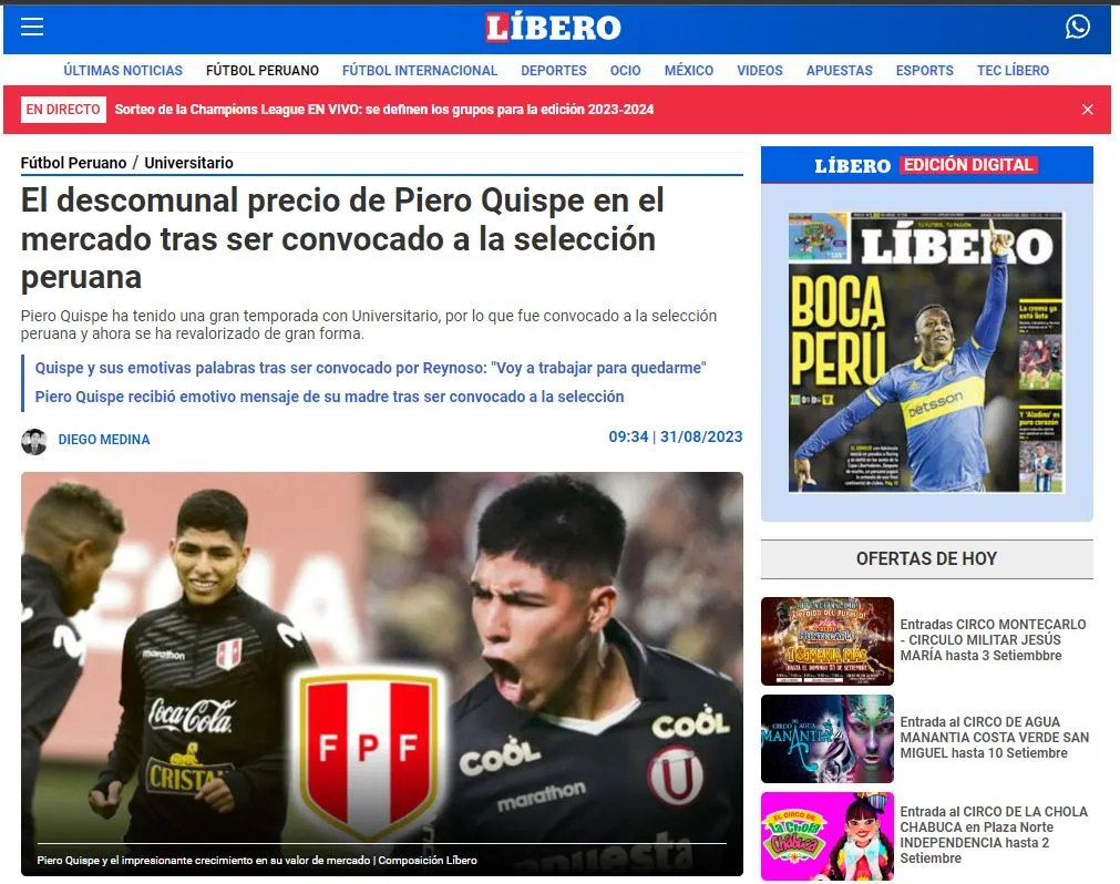 Podemos notar que la base explicativa de este tema, es el reconocido portal de transferencias deportivas, Transfermarkt. Donde se estudió esta eventualidad: “La tendencia es positiva para Quispe, quien de mantener su buen nivel y hacer unas grandes actuaciones en Eliminatorias, podría llegar a superar el millón de euros para alegría personal y del mismo club crema”.