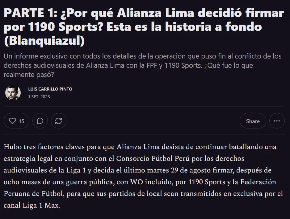 Luis Carrillo Pinto sobre el pase de Alianza Lima a 1190 Sports: “Primero y determinante, fue la entrada de los nuevos acreedores del Fondo Blanquiazul, segundo, la asesoría del estudio Payet y tercero, se habría concretado la llegada a Lima de los más altos directivos de TyC Sports y DIRECTV Latam para respaldar la operación”.