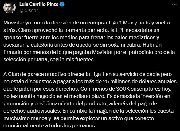 Contexto mucho mejor explicado por Luis Carrillo Pinto: “Movistar ya tomó la decisión de no comprar Liga 1 Max y no hay vuelta atrás. Claro aprovechó la tormenta perfecta, la FPF necesitaba un sponsor fuerte ante los medios para frenar los palos mediáticos y asegurar la categoría antes de quedarse sin soga ni cabra. Habrían firmado por menos de lo que pagaba Movistar por el patrocinio oro de la selección peruana, según mis fuentes”.