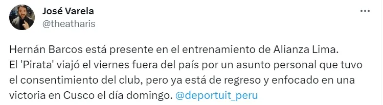 “El ‘Pirata’ viajó el viernes fuera del país por un asunto personal que tuvo el consentimiento del club, pero ya está de regreso y enfocado en una victoria en Cusco el día domingo”.