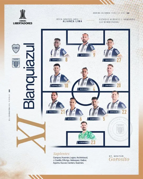 El once de Alianza Lima para jugar ante Boca Júniors es el siguiente: Viscarra, Enrique, Zambrano, Garcés, Trauco, Castillo, Noriega, Lavandeira, Quevedo, Ceppelini, y Barcos.