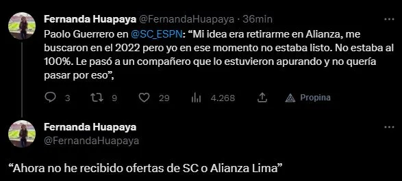 “No he recibido propuestas ni de Alianza, ni de Sporting Cristal ni de Emelec”. Descartando de pasada también, cualquier vínculo con equipos de nuestro país, como el Bombillo de Ecuador. En este momento, Paolo Guerrero está expectante de todo lo que pase con su carrera, abierto siempre a conversar.