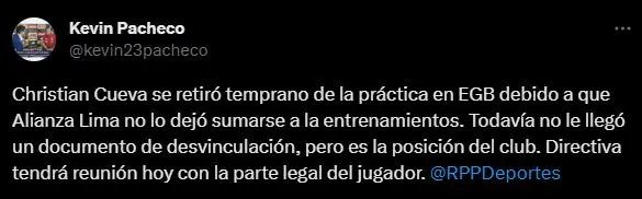 El dato principal lo brinda el periodista de RPP Noticias: “Christian Cueva se retiró temprano de la práctica en EGB debido a que Alianza Lima no lo dejó sumarse a los entrenamientos”. Kevin Pacheco contó eso, y también el movimiento del club, en contra del propio jugador.
