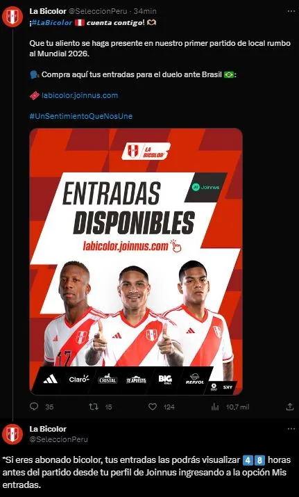 Mediante comunicado oficial, la selección de Perú dio a conocer que los hinchas podrán adquirir sus entradas a través de la plataforma de Joinnus.