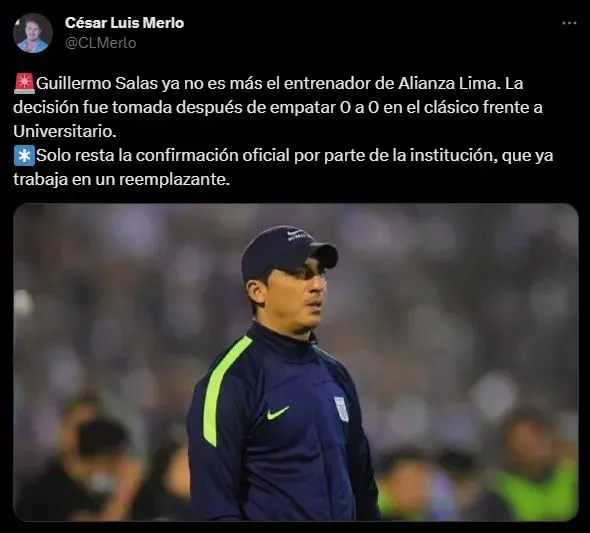 Lo que nos trae en esta oportunidad, es la noticia de Alianza Lima en el continente: “Guillermo Salas ya no es más el entrenador de Alianza Lima. La decisión fue tomada después de empatar 0 a 0 en el clásico frente a Universitario. Solo resta la confirmación oficial por parte de la institución, que ya trabaja en un reemplazante”.