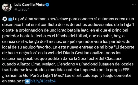 Para después ir un poco más allá, invitando a sus seguidores, a continuar la respuesta en un artículo especial: “En esta nueva entrega de mi blog “El deporte de hacer negocios” en la web del Diario Gestión analizo todos los escenarios posibles que podrían darse la 3era fecha del Clausura cuando Alianza Lima, Melgar, Cienciano y Binacional jueguen de locales tras haberse levantado la medida cautelar impuesta por la propia FPF. ¿Transmite Gol Perú o Liga 1 Max? Lee el artículo aquí y luego comenta en este post”.