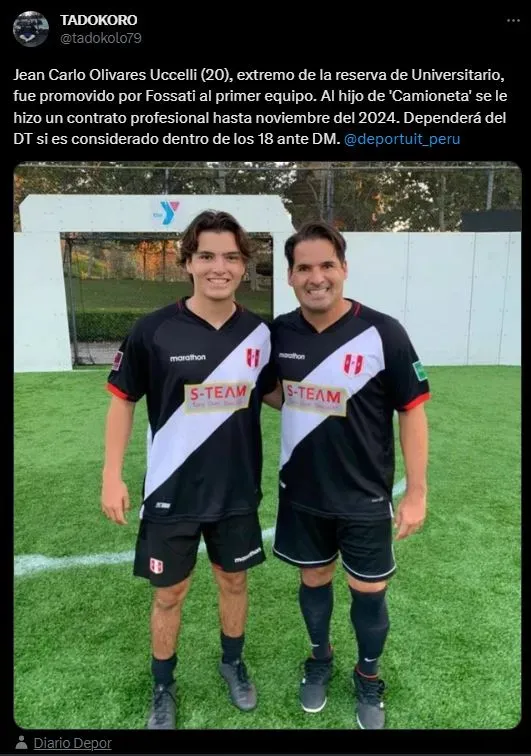 De esta manera lo presenta: “Jean Carlo Olivares Uccelli (20), extremo de la reserva de Universitario, fue promovido por Fossati al primer equipo. Al hijo de ‘Camioneta’ se le hizo un contrato profesional hasta noviembre del 2024. Dependerá del DT si es considerado dentro de los 18 ante DM (Deportivo Municipal)”.