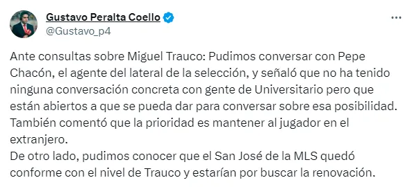 “En respuesta a las consultas sobre Miguel Trauco: Hemos hablado con Pepe Chacón, el representante del lateral de la selección, y él ha señalado que no ha mantenido conversaciones concretas con el personal de Universitario, pero que están dispuestos a explorar esa posibilidad en el futuro”, informó el comunicador en su cuenta oficial de X (anteriormente conocida como Twitter).