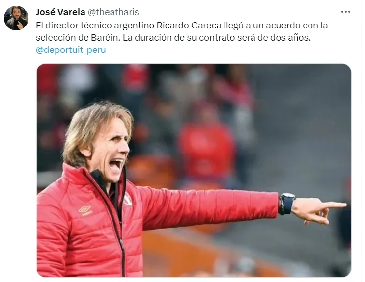 “El director técnico argentino Ricardo Gareca llegó a un acuerdo con la Selección de Baréin“, comentó en un inicio.