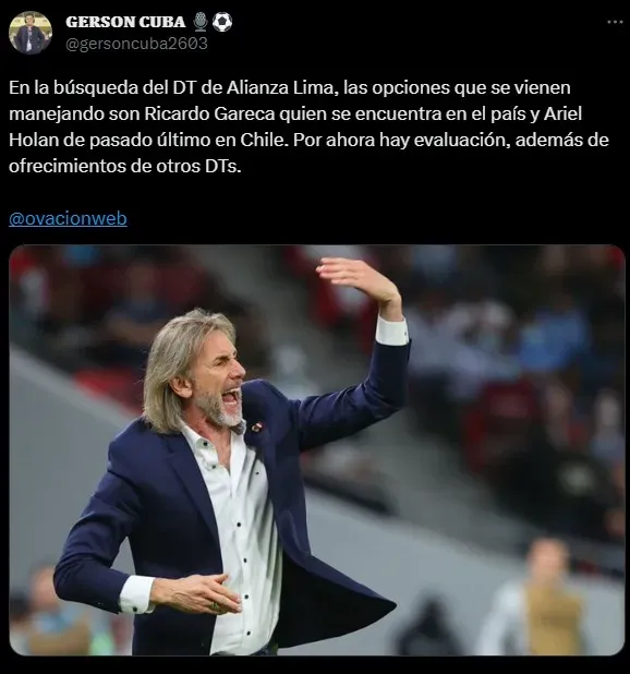 Por eso, los nombres más cercanos en este momento, al área de gerencia deportiva, son los siguientes: “En la búsqueda del DT de Alianza Lima, las opciones que se vienen manejando son Ricardo Gareca quien se encuentra en el país y Ariel Holan de pasado último en Chile. Por ahora hay evaluación, además de ofrecimientos de otros DTs”.