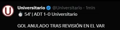 Ya en el segundo tiempo, saliendo con ímpetu, Universitario logró el empate 1-1 gracias a un golazo de José Rivera, pero el VAR asistió al árbitro y el tanto fue anulado.