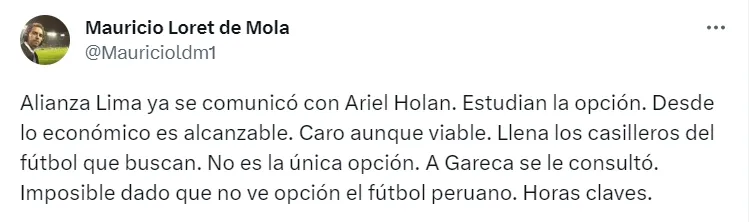 Llegando la información de diversos medios periodísticos, el primero que se animó a dar la noticia vía redes sociales fue Mauricio Loret de Molan. El periodista mencionó por qué Ariel Holan es la primera opción para llegar como nuevo estratega de Alianza Lima.