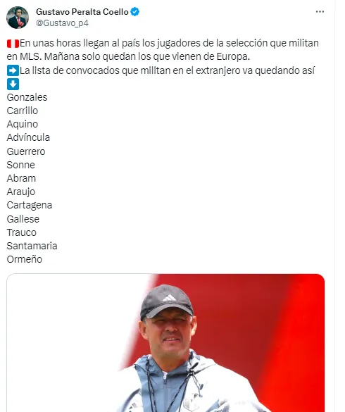 “En unas horas llegan al país los jugadores de la selección que militan en MLS. Mañana solo quedan los que vienen de Europa.La lista de convocados que militan en el extranjero va quedando así: Gonzales, Carrillo, Aquino, Advíncula, Guerrero, Sonne, Abram, Araujo, Cartagena, Gallese, Trauco, Santamaria y Ormeño”, mencionó el comunicador en su cuenta oficial de X (antes llamado Twitter).